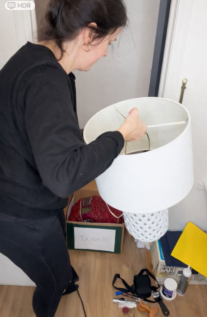 - 3 collapsible cube storage bins (I like using fabric collapsible bins — one for donate, one for sell, and one for not-sure-yet)