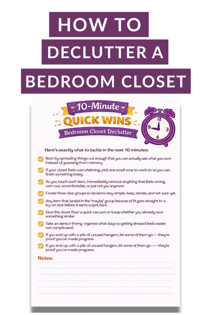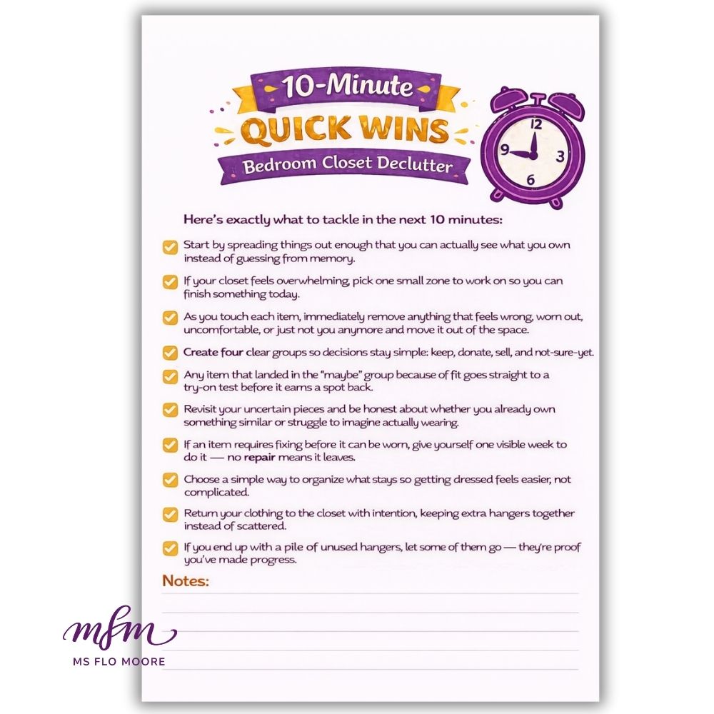 So today, I’m switching gears from big decluttering overhauls to something much more doable — a 10-Minute Quick Win. This week’s focus is your bedroom closet, and we’re using a simple checklist to make fast, meaningful progress without overwhelm.