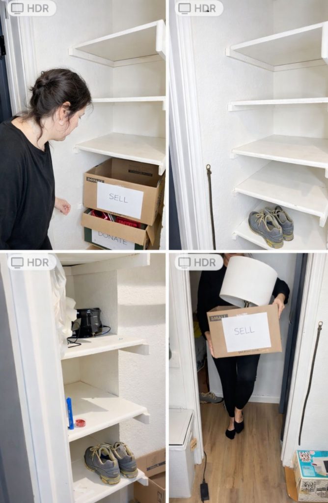 If you’re working on a shelf or top shelf, take everything off and place it on the floor or bed. If you’re decluttering a hanging section, slide items together or pull them out so nothing stays hidden.